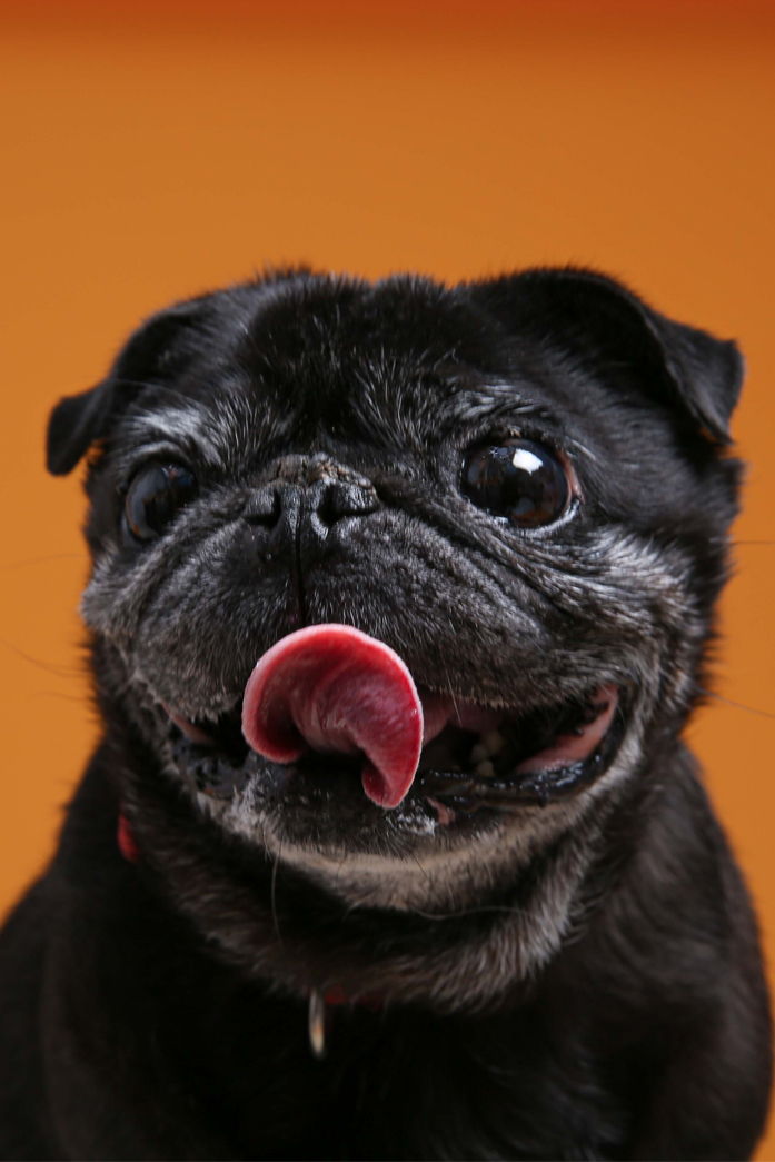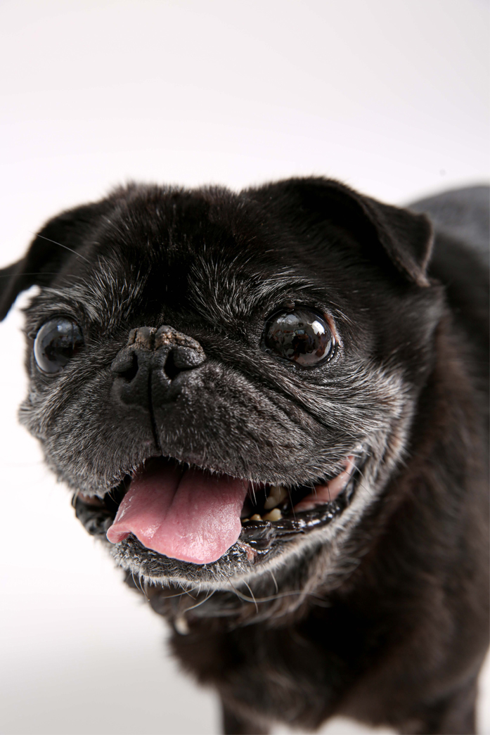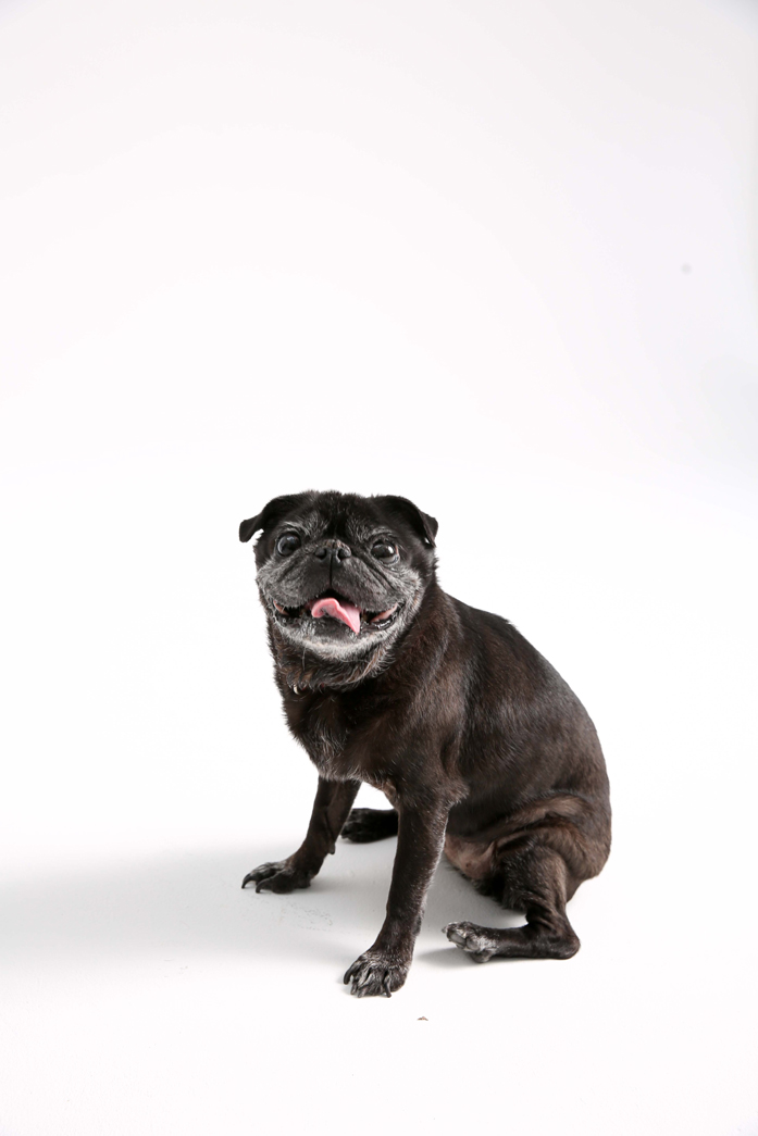 パグの11歳の女の子。おばあちゃんだけど頑張って撮影に望んでくれていました。「これでいい?」という感じで飼い主さんの方を見ながら撮影。プライベートではのんびりライフを送っているためか、緊張していたけどいい表情を見せてくれました。