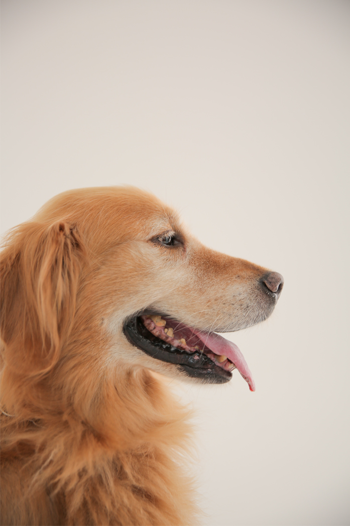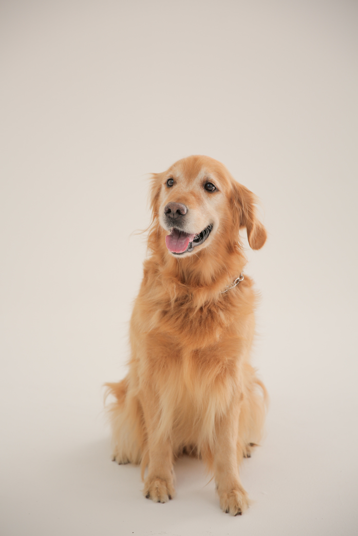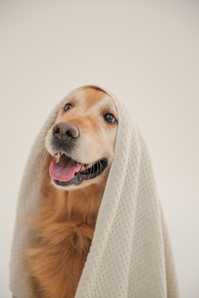ゴールデンレトリバーの10歳の女の子。カメラマンが名前を呼ぶと、すぐカメラの方まで走って来てしまうほど人懐っこい子。まるで湯上り後のようにタオルをかぶるショットも、嫌がらずにお茶目に披露してくれました。